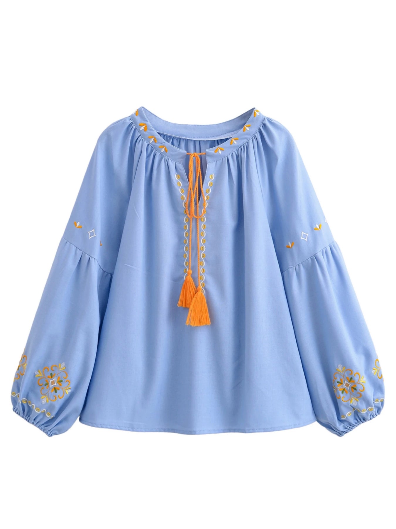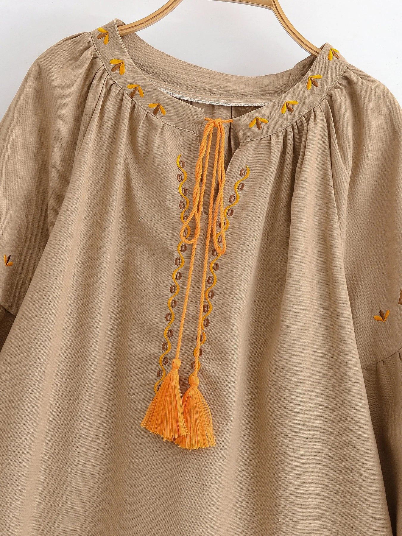 Tierra Boho Embroidered Blouse brings earthy elegance to your everyday style. Designed with flowy sleeves, warm-toned embroidery, and a soft tassel tie neckline, it blends comfort with artisanal charm. Perfect for relaxed days, effortless boho outfits, or adding a touch of crafted beauty to your wardrobe.