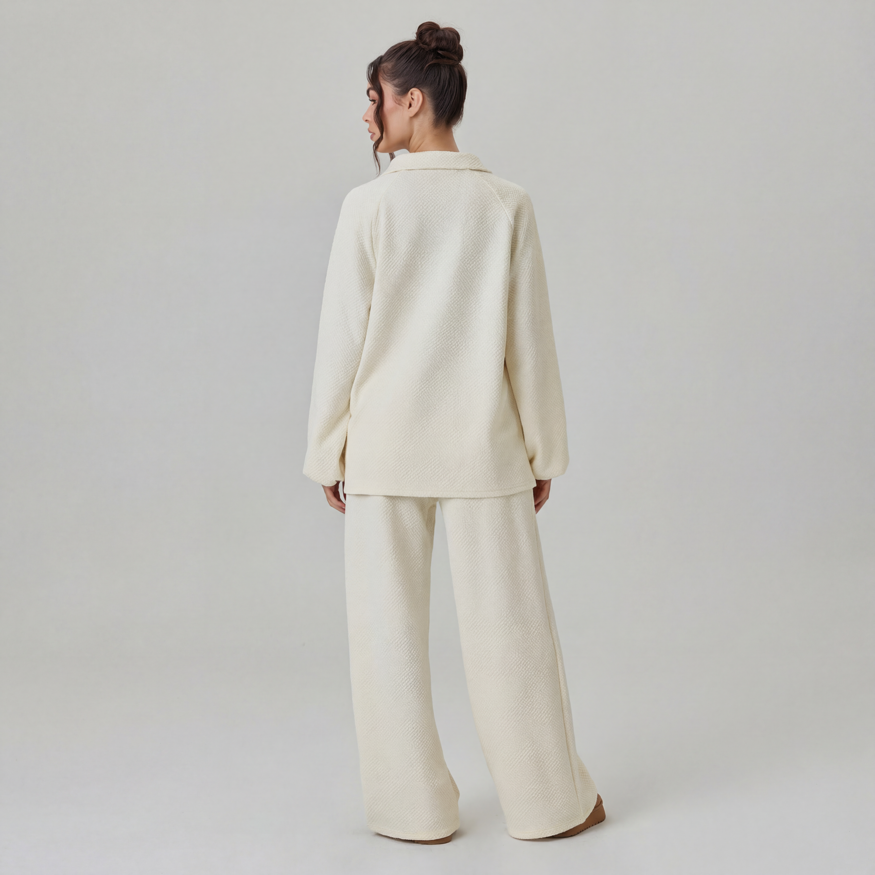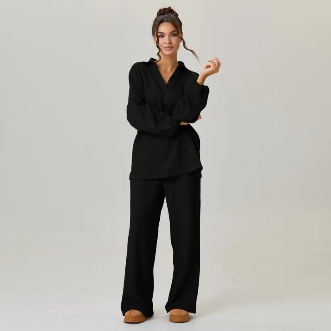A soft, textured knit set designed for effortless comfort and everyday ease. Featuring a relaxed long-sleeve top with wide-leg pants, Selene drapes gently on the body for a cozy yet elevated feel. Ideal for slow mornings, travel days, or lounging in style.