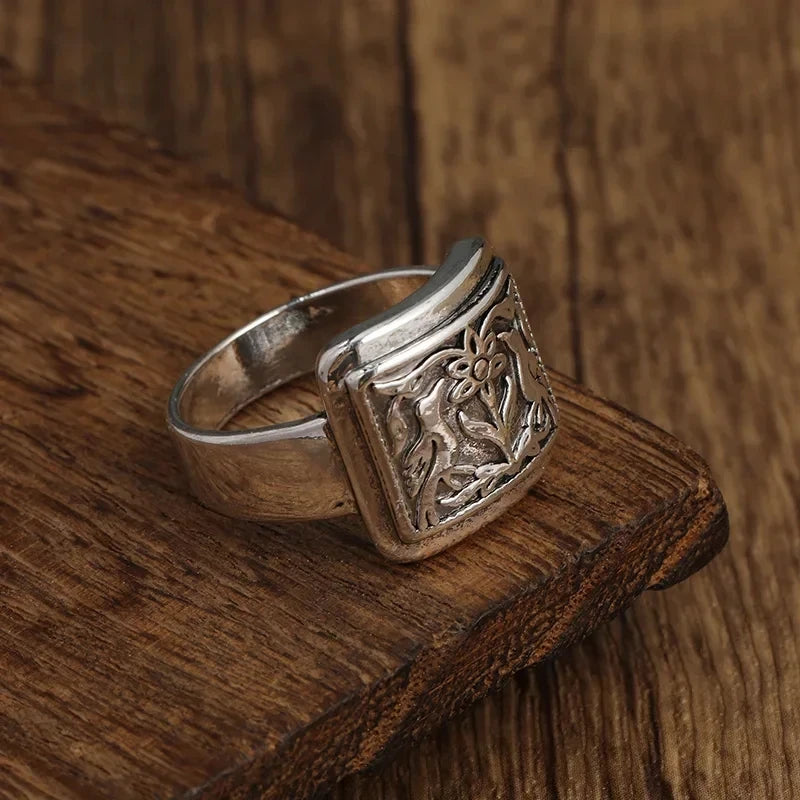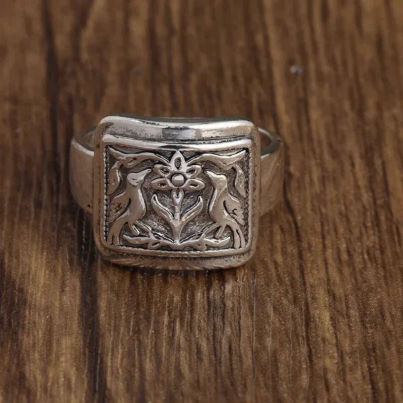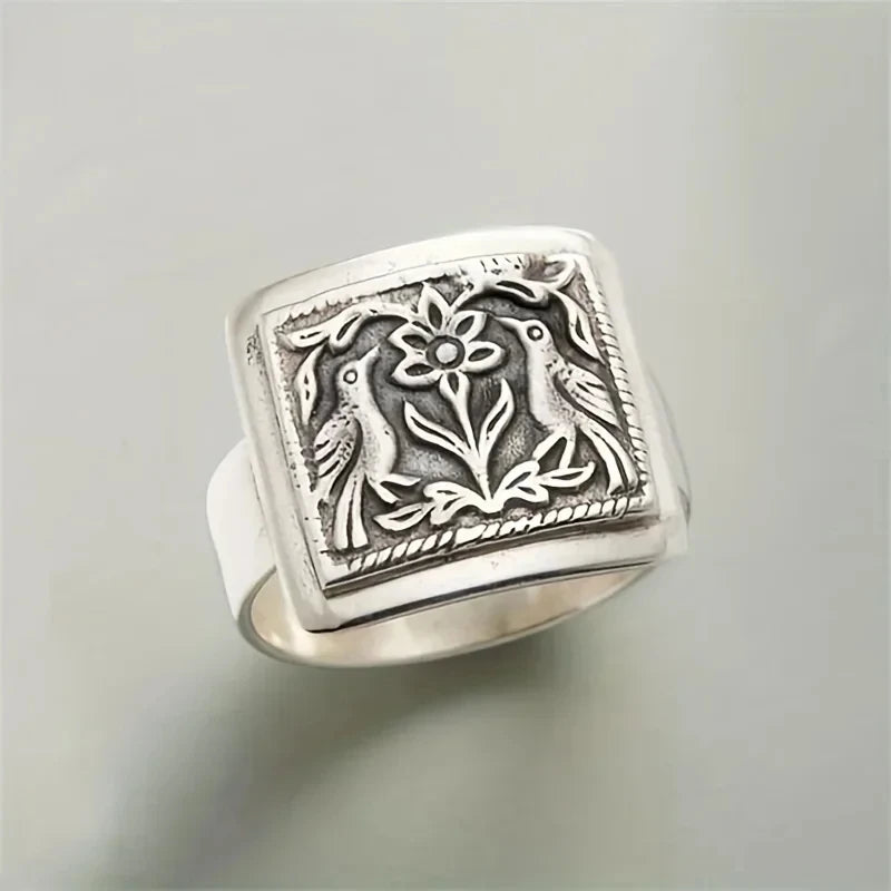 Two sparrows meet around a blooming flower, symbolizing unity and freedom. Intricately detailed with an antique finish, this bold signet ring carries the elegance of nature in every line.